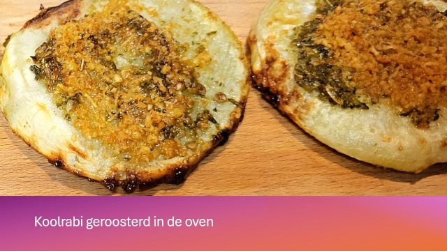 Plaats in de oven voor ongeveer 15 minuten. De koolrabi moet beetgaar zijn en er moet een krokant laagje gevormd worden.