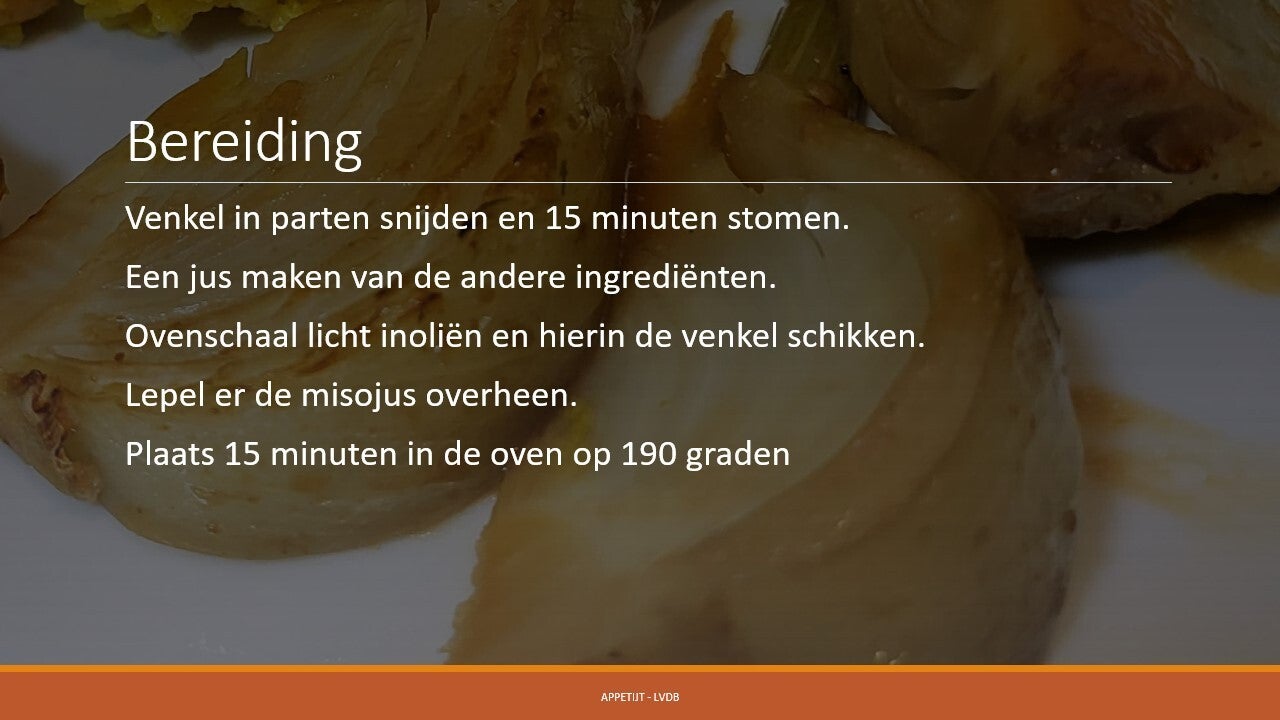 Een ovenschaal licht invetten en hierin de gestoomde venkelparten schikken.