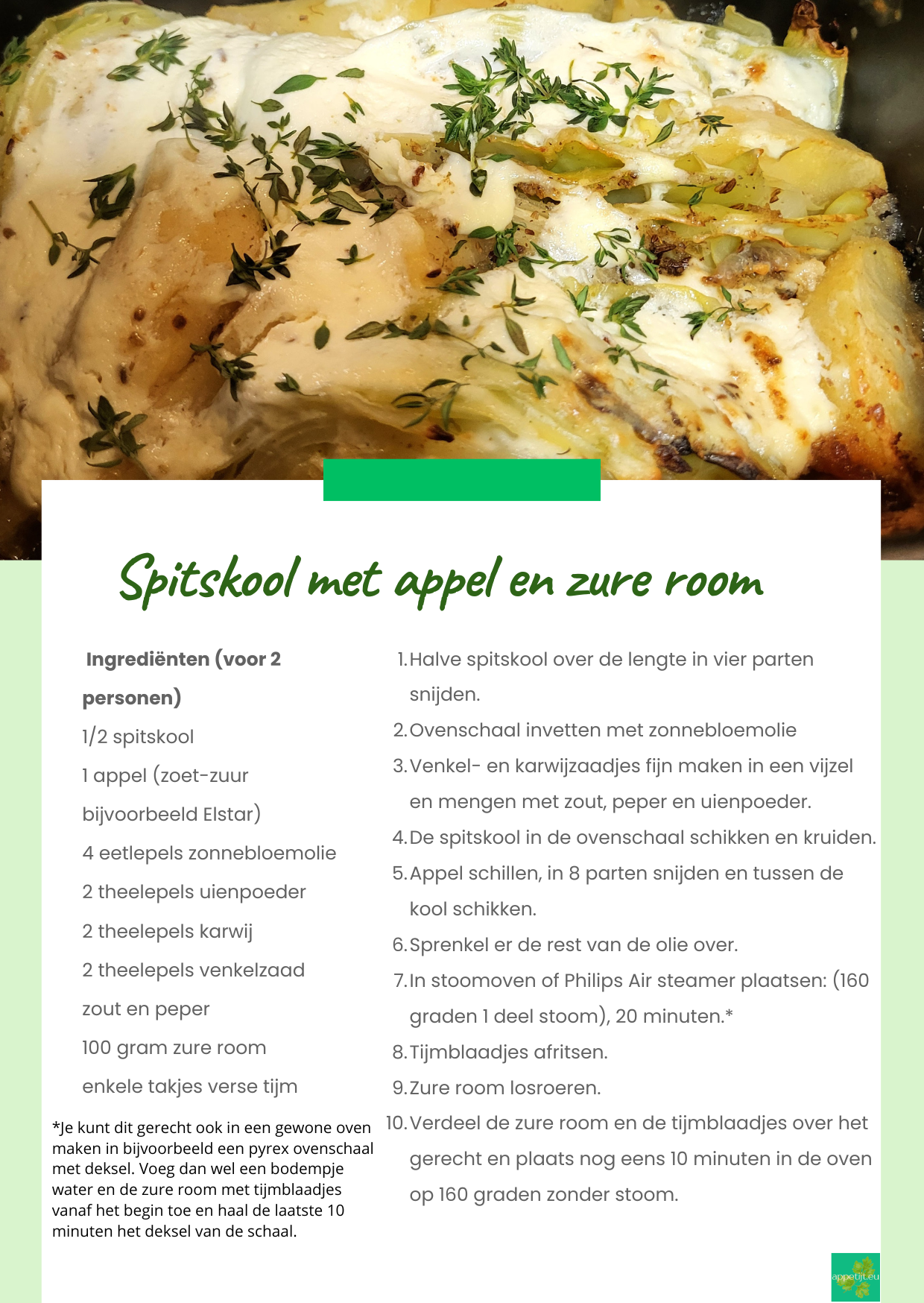 Verdeel de zure room en de tijmblaadjes over het gerecht en plaats nog eens 10 minuten in de oven op 160 graden zonder stoom.