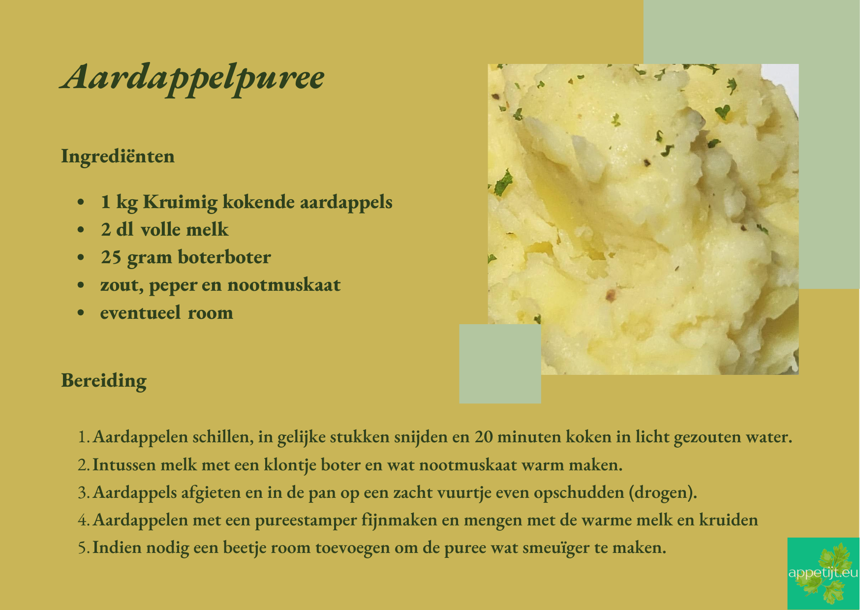 Aardappelpuree, stevig of een beetje zacht smeuïg, dat bepaal je zelf en hangt een beetje af van het gerecht waar je het bij geeft. Stamp eerst de aardappelen fijn met een pureestamper en voeg dan de warme melk met boter, beetje bij beetje bij om de juiste consistentie te krijgen die je wenst.