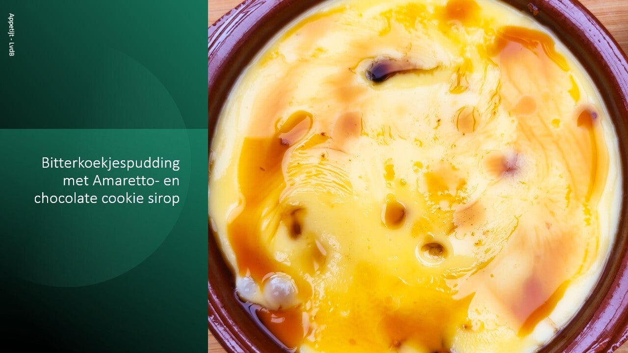 Schenk de warme pudding over de bitterkoekjes.