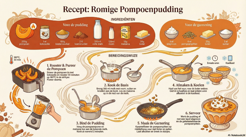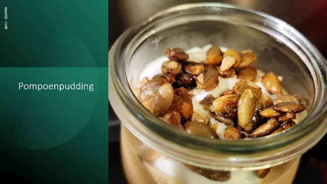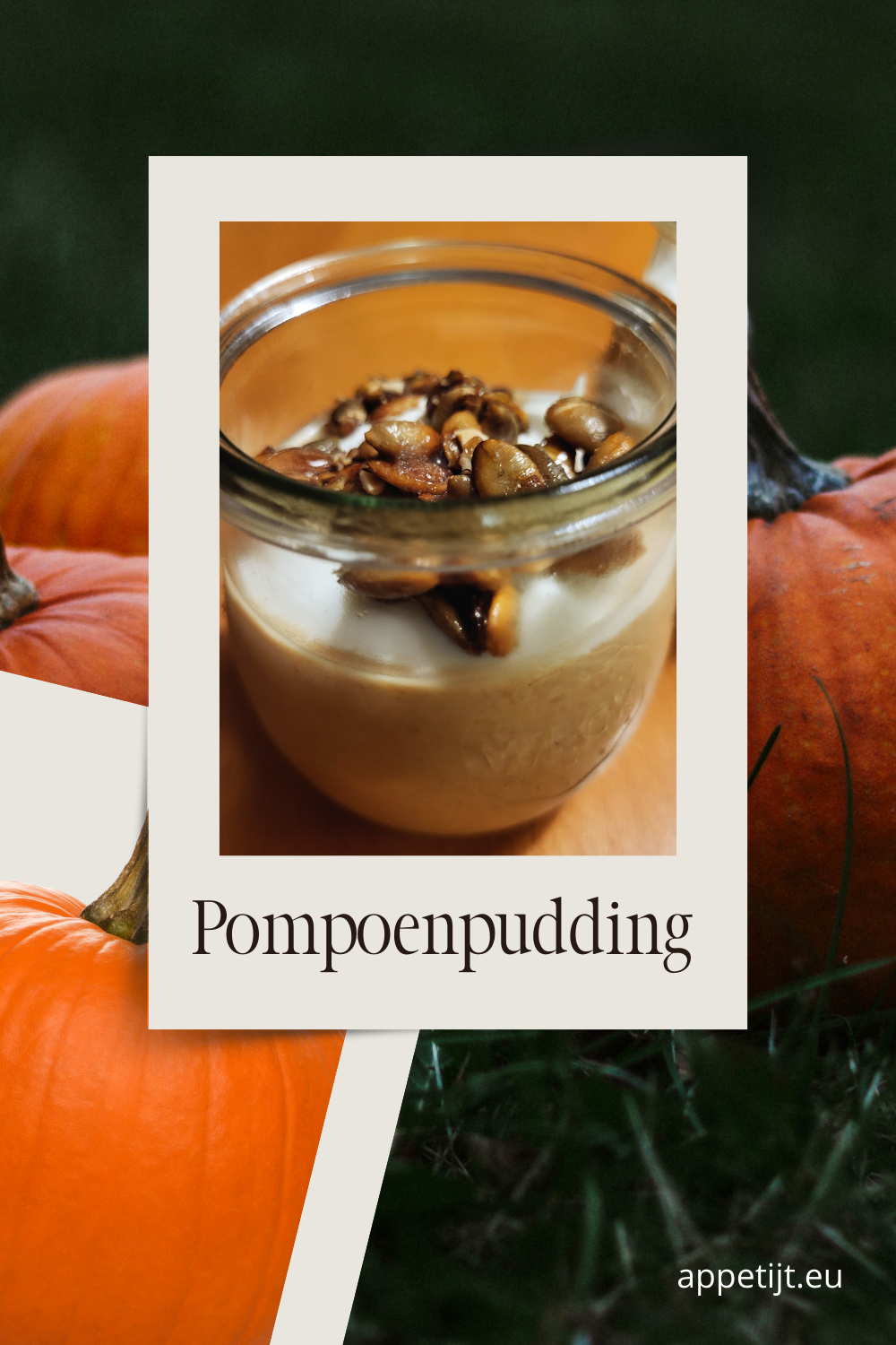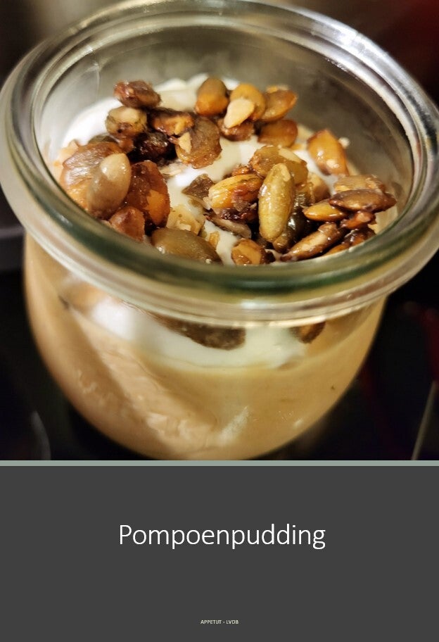 Werk de pudding af met een lepel lobbig geklopte slagroom en de pompoenpitten.