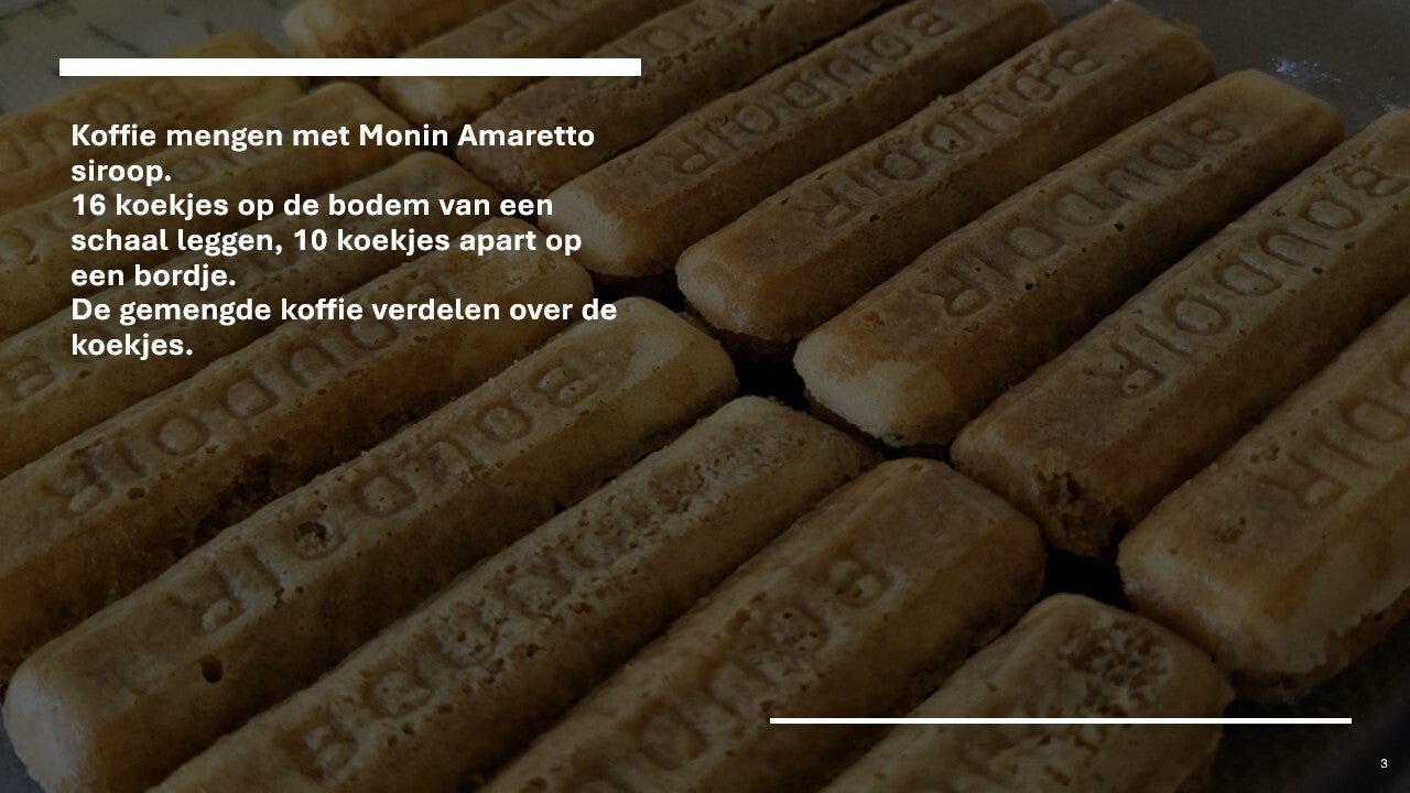 De andere 10 doordrenkte koekjes voorzichtig op de mascarponeroom schikken en daar weer de rest van de mascarponeroom op doen, glad strijken.