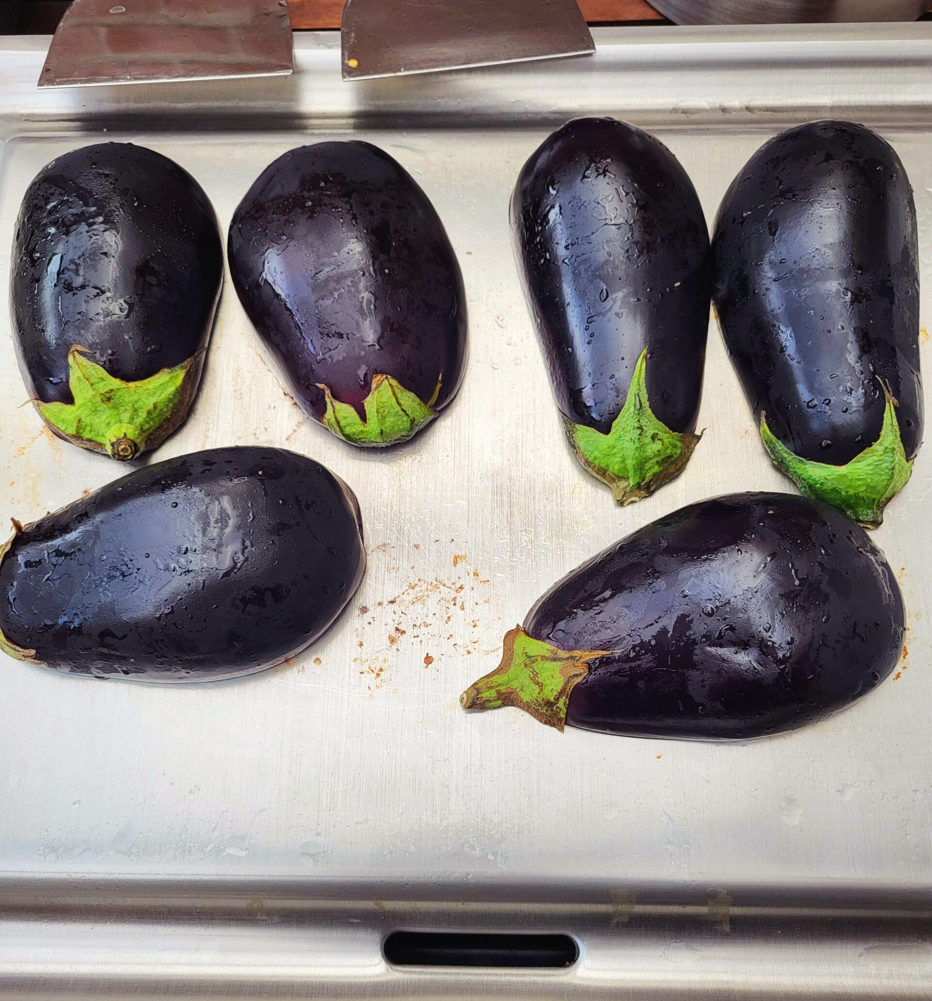 De aubergines op het snijvlak bakken tot ze licht gekleurd en voldoende gegaard zijn om het vruchtvlees eruit te lepelen.