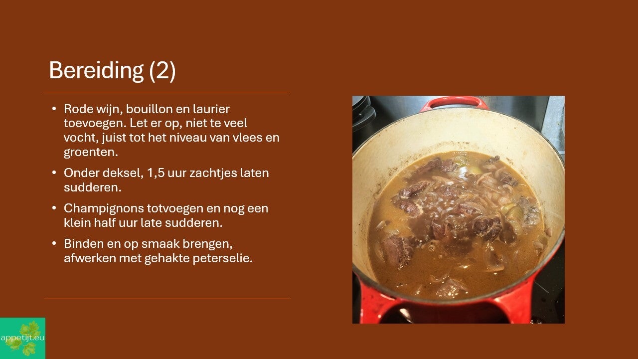 Onder deksel, 1,5 uur zachtjes laten sudderen.