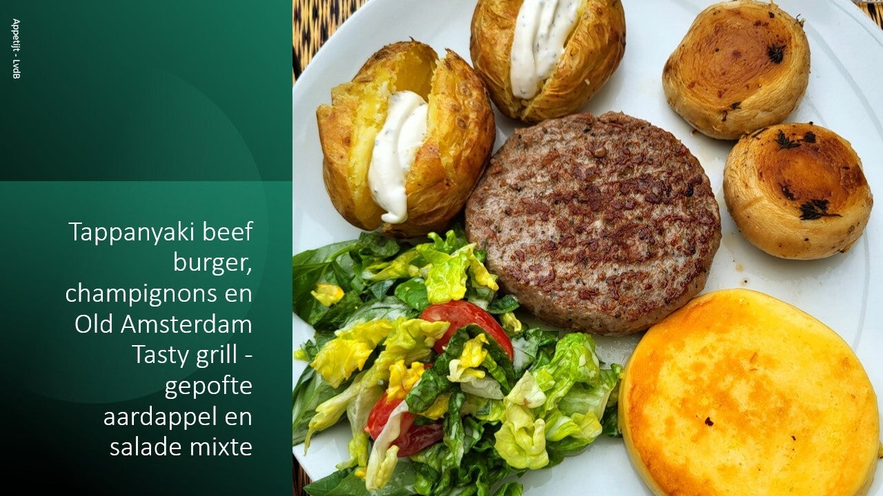 Gepofte aardappelBeef burger, Old Amsterdam Tasty grill en champignons op de teppanyakiSalade mixte (bindsla, kerstomaatjes, basilicum, lente-ui, dressing)