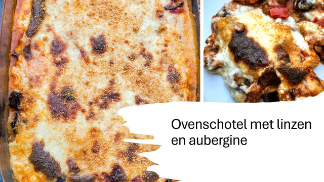 Daarin de gemengde groenten met linzen en daarop het mengsel van bechamel, ei en ricotta.