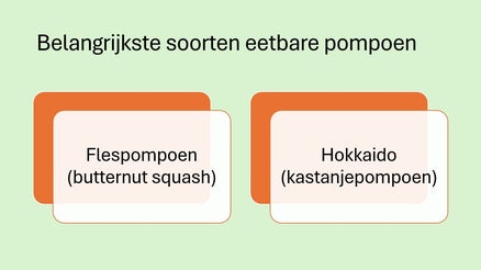 Er zijn heel veel soorten eetbare pompoen. Ik beperk me hier tot de naar mijn oordeel twee belangrijkste soorten: de hokkaido en de flespompoen. Deze twee zijn qua culinaire eigenschappen en smaak het beste te verwerken..Flespompoen (butternut squash) is de laatste jaren heel gewild omdat hij gemakkelijk te verwerken is, niet al te harde schil en een groot gedeelte zonder pitten en dus gemakkelijk in de gewenste vorm te snijden (plakken, balkjes, dobbelstenen, ...). Het vruchtvlees is mals, licht nootachtig van smaak en verder neutraal.De hokkaido i(ook wel kastanjepompoen genoemd) s misschien wel mijn favoriete pompoen maar toegegeven is wat moeilijker te verwerken dan de flespompoen. Heeft een harde schil en de kern bestaat uit losse natte draden met heel veel pitten. Daar staat tegenover dat de hokkaido meer aroma en smaak heeft.Alhoewel de pompoen misschien het meest gebruikt wordt voor de bereiding van soep, zijn er veel andere bereidingsmogelijkheden zoals stomen, purees, tray bakes, roosteren, wokken, stoverijen, tajines, frituren, bakken en zelfs zoete bereidingen zoals gebak, pudding, soufflé, mousse