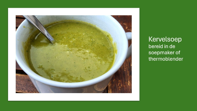 Groenten grof snijden en met water, bouillon, boter en de helft van de kervel in de kan doen.
