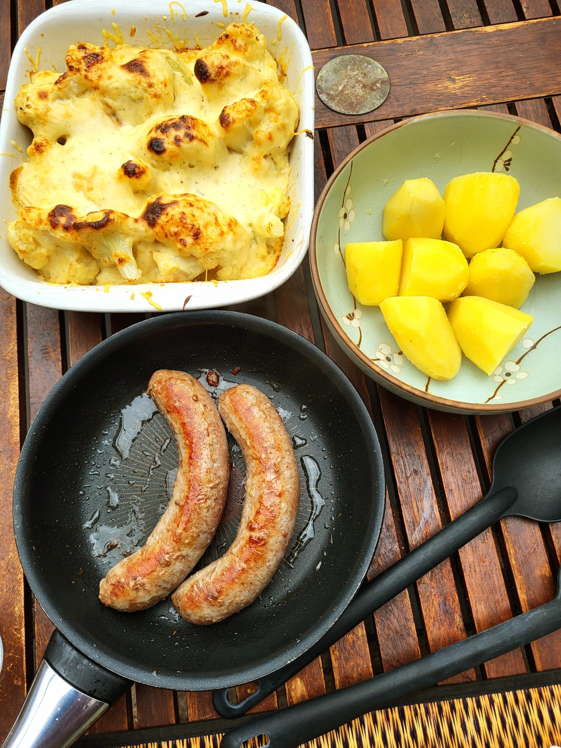 Braadworst, gestoomde aardappelen, bloemkool met kaassaus uit de oven